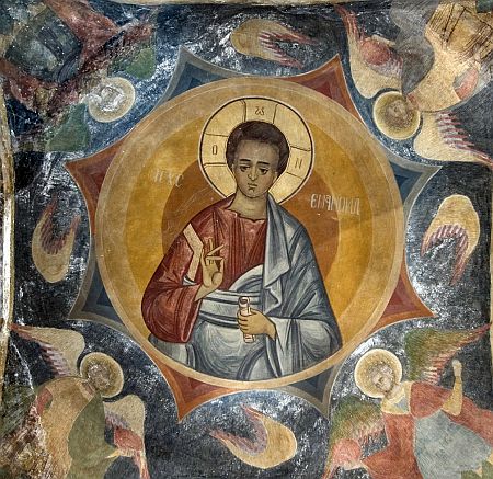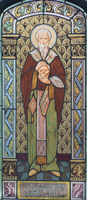 Evanghelie în mâna stângă; - Sfântul Haralambie ținând în mâini un craniu.