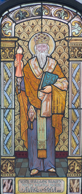 - Sfântul Spiridon cu o flacără în mâna dreaptă și Sfânta